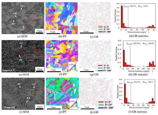 Microstructure and crystallographic characteristics of the HAZ with different heat parameters: (a–d) preheating at 150 °C of 1800 J/mm, (e–h) 2250 J/mm, (i–l) 2700 J/mm.