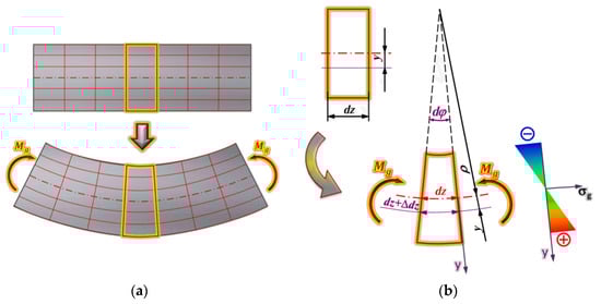 Yellow indicates the mesh elements located in one plane of the cross section of the sample in the undeformed state (Figure 1a). After the beam in the symmetry plane “yz” is deformed by the action of the moment, Mg, the planes of the marked cross section will tilt towards each other at an angle. The upper and lower fibres will shorten and lengthen, respectively. The length of the fibres located in the neutral plane will not change. Under the influence of the moment, Mg, the sample will expand in the upper part, and the initial rectangular cross section of the sample will take a trapezoid shape (Figure 1b). If we denote the radius of curvature of the neutral layer by ρ, then the length of the neutral layer fibre section can be expressed by the following formula: