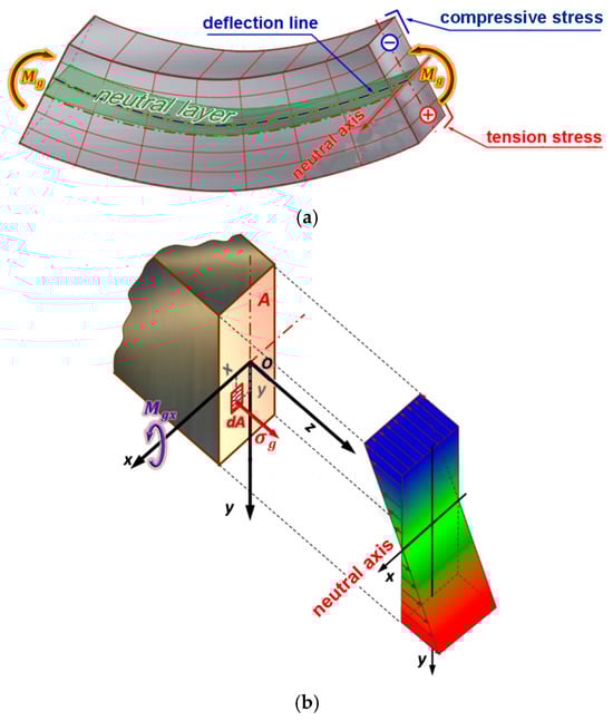 The moment of the elementary force in relation to the neutral axis (Figure 2b) is , and the sum of these moments integrated over the entire area (A) of the cross section of the beam must balance the moment (Mgx) applied to the beam, so the second equilibrium condition of the beam under consideration (Figure 2) takes the following form: