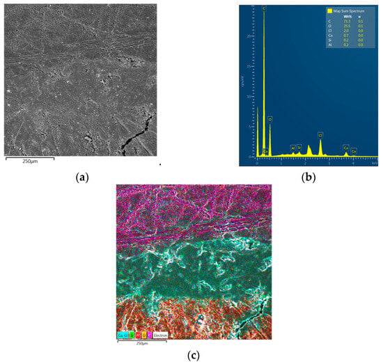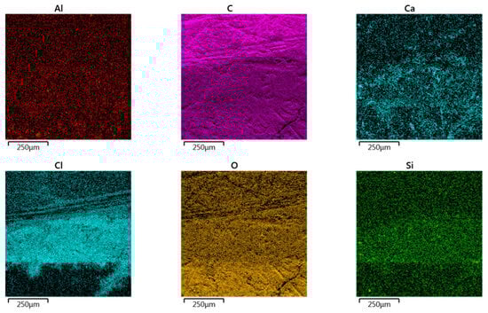 Figure 4b presents the results of the chemical composition of the sample shown in Figure A4. An interface between the CFRP laminate, adhesive and plywood (from top to bottom in Figure 4c) was considered. As can be seen (Figure 4c), there is a varied distribution of elements in the analysed area. As can be predicted, when analysing the area of the CFRP panel, the largest share of carbon occurred here. This is understandable due to the structure of the CFRP panel. Moving downwards, we can distinguish the glue layer, for which a significant composition of chlorine and silicon is noted. This is the result of the participation of these elements in the chemical composition of the adhesive. In the last layer of the analysed area, the dominant elements are carbon and oxygen. This is obviously due to the fact that plywood is an organic material. Figure 5 shows the distribution of dominant elements in the analysed area (Figure 4a).