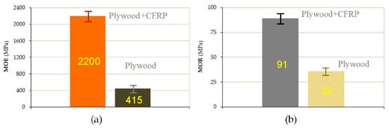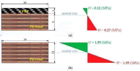 The most commonly used wood-based composites include sandwich materials, such as plywood or veneered wood, which are classified as layered laminates with better strength properties than natural raw materials [5,7,8]. In some applications, such as construction, wood-based materials are preferable to other engineering materials such as concrete, plastics or steel because it is a particularly important aspect to meet high-strength property requirements at a relatively low weight [6]. Plywood is a rigid structural material consisting of wood veneers glued together so that the veneer fibre orientation is perpendicular to the fibre orientation of the adjacent layer [1,3]. The properties of plywood plates depend on the type of wood used. In some cases, wood species (e.g., pine) are used for plywood production. However, they exhibit poor mechanical properties. Therefore, research is being conducted on how to improve these properties [9,10,11]. One option is to reinforce wood-based materials with different types of fibres with the main aim of improving their mechanical properties [12]. Wood-based materials with a hybrid structure have become necessary in engineering structures due to their better strength properties compared to basic materials [13,14]. Due to there being various interconnected materials with clearly different properties, it is necessary to analyse the resulting hybrid materials. Carbon fibre-reinforced polymer composites (CFRPs) are an interesting group of engineering materials [15,16]. Their main advantage, compared to conventional materials used in structural engineering, is a high specific strength (the ratio of tensile strength to specific gravity) [13,14,16]. Fibre-reinforced polymer materials have been widely regarded as good reinforcement materials in the repair and rehabilitation of cultural heritage buildings because of their good corrosion performance and high stiffness [17,18]. Most often, composite plates, rods or strips are used for repairing existing buildings or retrofitting recycled materials in historical buildings [19]. The use of CFRPs and glass fibre-reinforced plastics (GFRPs) for improving wooden columns provides the columns with increased compressive strength and improved ductility [20]. Many authors indicate a good retrofitting effect of using CFRP composites [21,22,23]. Due to CFRPs’ high specific strength, the use of CFRPs in vehicle construction has been steadily increasing in recent years, as exemplified by the increasingly widespread implementation of this material in many structural assemblies of motor vehicles and yachts.