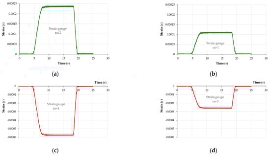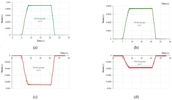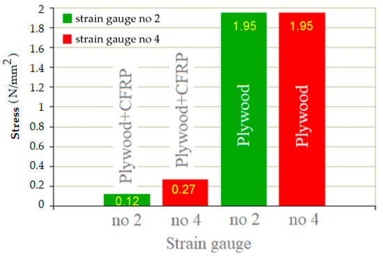 During the tests, deformation measurements were taken for both the sample obtained from the combination of plywood with a CFRP panel and the plywood only. The force loading of the beam shown in Figure A7 was 30 N. The strain gauges were glued to both sides of the bending beam. The signal recording system used the NI Compact Four-Slot cDAQ-9132 Controller (National Instruments, Austin, TX, USA). The signals from the strain gauges were registered via the quarter-bridge strain gauge NI-9236 (National Instruments, Austin, TX, USA).