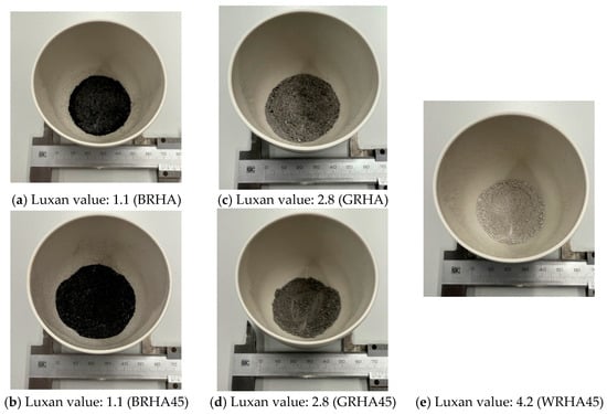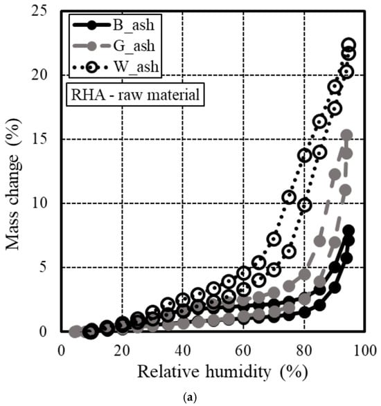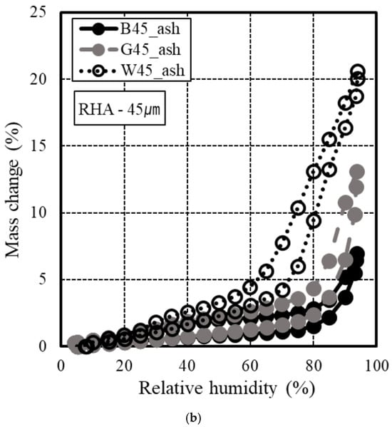 As shown in Figure 5, the isothermal adsorption–desorption curve yielded the following results: specimens with elevated Luxan values exhibited a notable increase in weight due to water vapor adsorption, indicating the presence of a substantial quantity of mesopores. Additionally, the RHA sample with a 45 μm particle size adjustment demonstrated comparable outcomes to the raw RHA in terms of color. In terms of weight change, the 45 μm particle size-adjusted specimen had a lower weight compared to the raw RHA material, suggesting that the microstructure of the RHA was affected. This outcome is attributed to the influence of the porous RHA structure, which operated in a manner similar to that previously described [12,22].