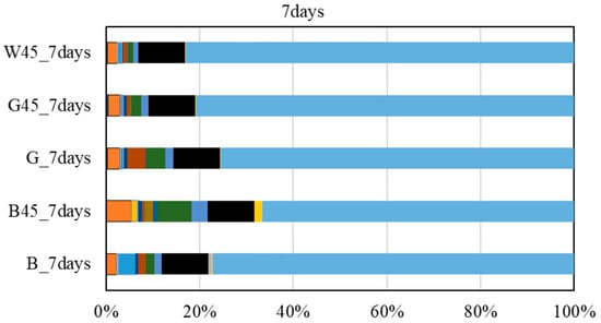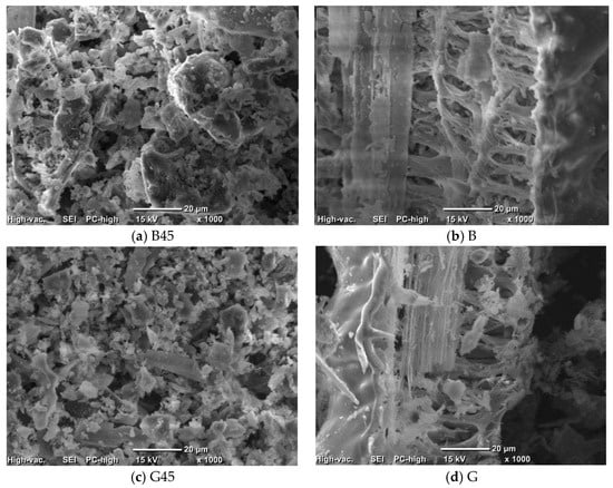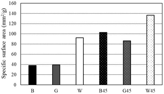 Figure 6 shows the results for specific surface areas. The specific surface area, calculated using the BET method from the isothermal adsorption/desorption curves in the RH range of 10~35% during desorption, revealed that the two raw material samples, B and G, exhibited nearly identical results, while W had a larger specific surface area compared to the others. Additionally, the particle size-adjusted samples generally had a higher specific surface area than the raw material samples, with B45 and G45 showing results similar to those of W, and W45 exhibiting a more pronounced increase.