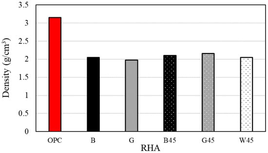 Density was tested following the JIS R 5201 standard [48]. Measurements were conducted using a Le Chatelier flask and kerosene. The sample used for density measurement had an unadjusted RHA of 45 microns.