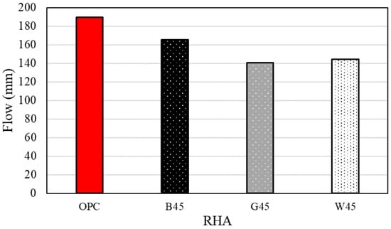 Figure 7 and Figure 8 present the results and a photograph of the flow experiment, respectively. As shown in Figure 8, flow measurements could not be conducted on the test specimen with RHA before particle size adjustment due to moisture absorption. The specimens containing 45 µm RHA exhibited reduced absorption of mixing water, resulting in improved flow. B, with a low Luxan value, demonstrated a high flow value, which inversely correlated with the maximum weight change observed in the isothermal adsorption curve (Figure 5). This phenomenon is attributed to the reduction in RHA micropores identified during grain-size adjustment [11], which positively influenced fluidity. Additionally, other studies have reported that the pore structure of RHA absorbs water, a finding confirmed in this study [22,24,47].