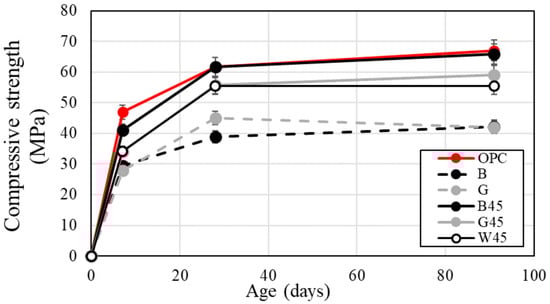 This trend is attributed to the increased specific surface area resulting from particle size adjustment. Comparative analysis of RHA specimens B45, G45, and W45 revealed that B45 consistently demonstrated the highest compressive strength at all curing ages, outperforming the other two specimens. Additionally, RHA with adjusted particle sizes showed a tendency for enhanced compressive strength, likely due to improved bonding with aggregates [26,51]. The compressive strengths of specimens G45 and W45 were similar. Slope analysis of the graph in Figure 9 showed that the RHA specimens with adjusted particle sizes exhibited a significantly greater increase in compressive strength from 7 to 28 d compared to the OPC. However, the increase in compressive strength from 28 to 91 d was not significantly different from that observed for the OPC. These findings suggest that the pozzolanic reaction was most active between 7 and 28 d. The rate of increase in compressive strength was a function of curing age. Reducing the RHA particle size led to a higher rate of increase in compressive strength from 7 to 28 d. The data indicate that finer RHA particles resulted in a greater increase in compressive strength during this period. Furthermore, the relationship between the Luxan value and compressive strength suggests that the rate of strength increase correlates with the Luxan value, indicating that the Luxan value is proportional to the pozzolanic reaction of amorphous silica. The increase in compressive strength due to RHA is attributed to both the filler effect and pozzolanic reaction [52]. At 28 d of curing, the compressive strength of specimens substituted with raw RHA decreased, consistent with findings from other studies. This decrease is believed to result from an increased number of voids associated with RHA use [4,10,16].
