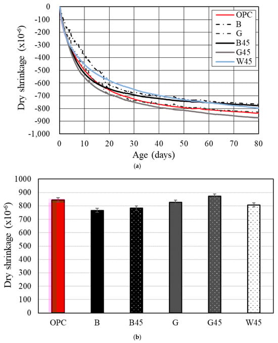 Figure 10a displays the dry shrinkage results for each specimen based on the average data obtained from embedded gauges on three specimens. Except for G45, the RHA specimens exhibited dry shrinkage results that were either similar to or lower than those of the OPC. The RHA test specimens with particle control showed lower drying shrinkage than the test specimens without particle control. In addition, B showed lower drying shrinkage overall than G. A comparison of the dry shrinkage strain between raw RHA and 45 µm RHA specimens revealed that the latter had a greater tendency towards larger dry shrinkage. B45 showed compressive strength comparable to OPC but with reduced drying shrinkage relative to OPC. Figure 10b illustrates the drying shrinkage strain at 80 d. The results for RHA specimens B, G, B45, and G45 indicated that a lower Luxan value corresponded to a smaller dry shrinkage strain. This observation aligns with the trends reported in the literature [12,14].