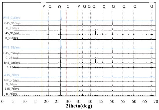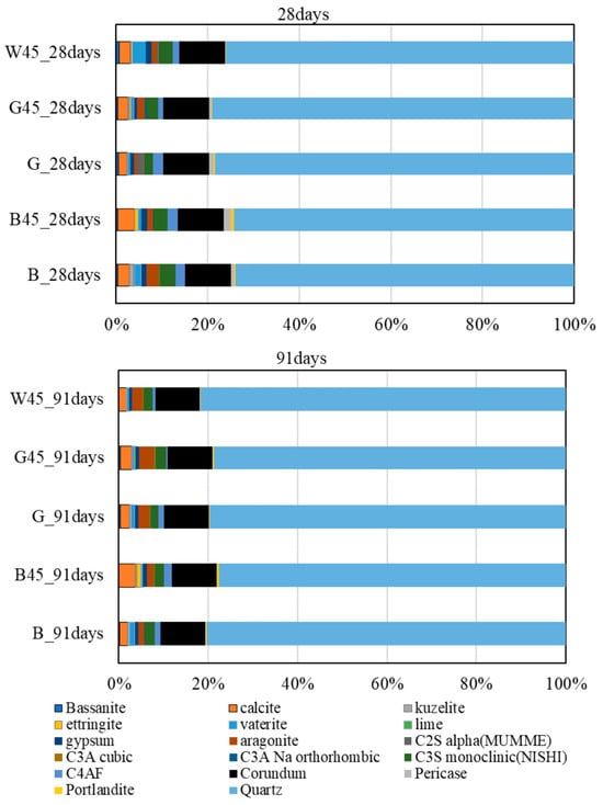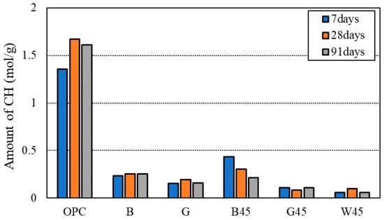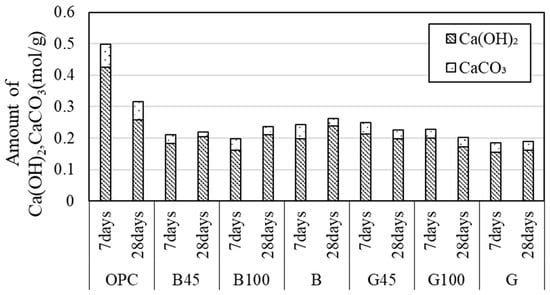 For XRD measurements, the samples collected from each curing age were pulverized to a particle size of less than 300 µm. The measurement conditions included a voltage of 30 kV, a tube current of 10 mA, a step width of 0.01°, and a diffraction angle range of 2θ = 5° to 75°. Additionally, 10% α-alumina was mixed with the samples for analysis using the Rietveld method. TOPAS V5 (manufactured by Bruker AXS, Billerica, MA, USA) was used for Rietveld analysis, and the data were interpreted based on the XRD measurements. The amount of amorphous content was determined by comparing the amount of calcium hydroxide in TG-DTA with the amount of reference material (α-alumina).