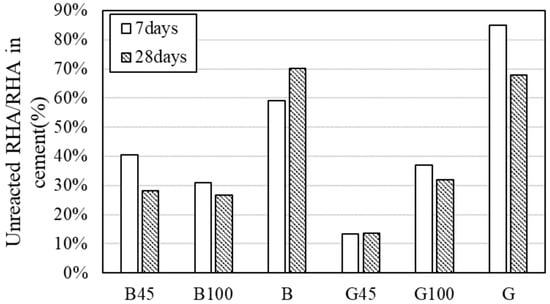 Table 6 presents the results of the hydration-rate experiments. Reaction rate tests were conducted using the selective dissolution method proposed by Osawa et al., which effectively recovered unreacted fly ash [47]. Since RHA primarily consists of SiO₂ and exhibits properties similar to fly ash, the quantity of residual RHA was determined using a comparable method. A solution of 2N hydrochloric acid and 5% aqueous sodium carbonate was added to the powder sample to dissolve the cement and cement hydrates. The mass of each sample was then measured after drying. The insoluble residual rates for each sample were 93.07% and 85.44%, respectively. Reaction rates were corrected using the calculated insoluble residual rates. The specimens were cured in water, and measurements were taken at each curing age.
