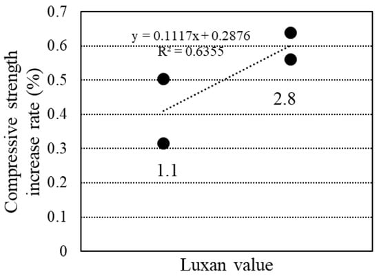 Figure 19 illustrates the relationship between the Luxan value and the rate of increase in compressive strength at 28 d compared to 7 d. A higher Luxan value was associated with a greater rate of increase, indicating that an increase in the Luxan value accelerated the pozzolanic reaction and resulted in a significant rise in compressive strength.