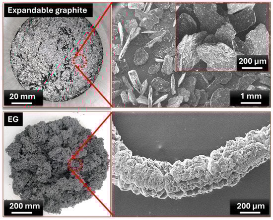 Figure 2 shows the morphological structure of expandable graphite and EG particles, revealing significant insights into their physical transformations and properties relevant to composite applications. The expandable graphite in its initial state can be seen in the upper section of Figure 2. The left-side image displays a macro-scale photograph with a scale of 20 mm, showing the shiny flake-like appearance typical of natural graphite. When magnified on the right, with a scale of 1 mm, the graphite particles exhibit a layered flake morphology, a characteristic feature of expandable graphite. These flakes are closely packed and appear dense and compact, which is crucial as the layered structure allows for significant expansion when subjected to high temperatures. The lower section of the figure illustrates the expanded state of expandable graphite after thermal treatment. The left-side image shows a macro view of EG, where the material exhibits a much larger volume, and a more porous sponge-like structure compared to the compact pre-expanded form. The scale here is 200 mm, emphasizing the large expansion effect achieved. Upon magnification (right image, 200 µm scale), the EG reveals a unique cellular structure, with individual graphite particles that have puffed up and fused into a network of interconnected layers. This porous interlayered structure enhances the material’s surface area and thermal insulation properties, making it highly suitable for thermal management applications. Consequently, the images depict the transformation of expandable graphite into EG, demonstrating the drastic increase in volume and porosity due to thermal treatment. The expanded form’s porous structure is advantageous in applications where thermal conductivity and heat dissipation are essential, as the structure allows for efficient heat transfer while maintaining a lightweight and adaptable framework. These morphological characteristics support the effectiveness of EG in composite materials, especially for PCM composites in thermal energy storage, where the expanded structure can accommodate and support the PCM within its network, as stated in the literature [54,55].