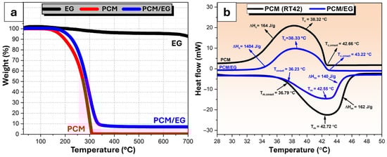 Figure 4 presents the curves illustrating the TGA and DSC results. In Figure 4a, the TGA results display the weight loss profiles of three samples: pure expandable graphite, pure PCM, and a PCM/EG composite, across a temperature range from room temperature to 700 °C. The weight loss behavior provides insight into the thermal stability and decomposition stages of each material. The TGA curve of EG shows exceptional thermal stability, with a negligible weight loss up to approximately 700 °C. This stability indicates that EG undergoes minimal thermal decomposition or volatilization within this temperature range, making it an excellent structural component in high-temperature applications. The weight loss is primarily due to the decomposition and release of residual oxygen-containing functional groups or intercalated substances, such as sulfuric acid or nitric acid, used during the initial preparation or exfoliation process. This results in a gradual reduction in weight as these components decompose and volatilize under increasing temperatures [62,63]. The pure PCM sample exhibits a significant weight loss starting around 150 °C and continuing until approximately 350 °C, where the weight loss reaches a plateau. This indicates that PCM undergoes thermal degradation within this range, which may involve the evaporation or decomposition of the material’s organic components. The final residual weight is close to zero, indicating that PCM is almost entirely decomposed at high temperatures. The PCM/EG composite demonstrates a weight loss profile that lies between pure PCM and EG. The composite starts to lose weight around the same temperature as pure PCM (approximately 150 °C) but shows a slower rate of decomposition. By 350 °C, the PCM/EG composite retains more weight than pure PCM, suggesting that the presence of EG improves the thermal stability of PCM. This could be due to the protective effect of EG, which may limit the volatilization of the PCM components by creating a physical barrier. This behavior highlights the synergistic effect of the EG on enhancing the composite’s thermal stability as stated by Zhang et al. [64]. Additionally, for the PCM/EG composite, the residual mass was approximately 9%, indicating that almost all PCM was thermally decomposed, leaving behind only the EG fraction. This observation aligns well with the theoretical composition of the composite, which is approximately 90% PCM and 10% EG by weight. The close agreement between the theoretical and experimental results validates the uniform impregnation of PCM within the EG matrix and supports the reliability of the composite preparation method.