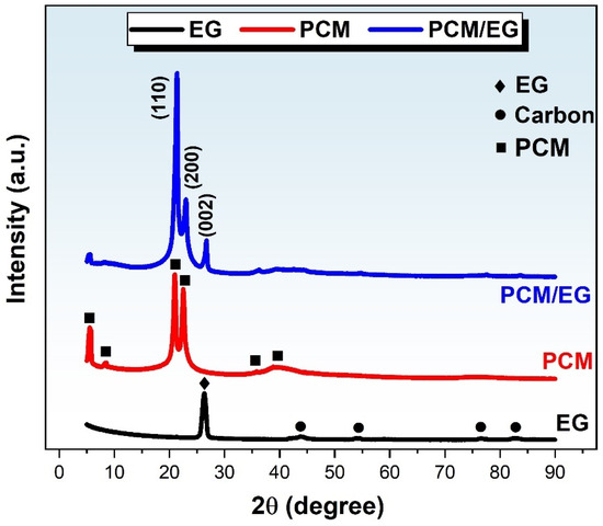 XRD patterns of the EG, PCM, and PCM/EG composites.