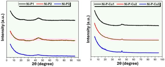 Figure 7 displays the X-ray diffraction (XRD) patterns for the Ni-P and Ni-P-Cu coatings applied to PCM/EG composite packs, with the left panel showing patterns for Ni-P coatings (Ni-P1, Ni-P2, Ni-P3) and the right panel displaying patterns for Ni-P-Cu coatings (Ni-P-Cu1, Ni-P-Cu2, Ni-P-Cu3). These diffraction patterns provide insights into the phase composition and crystallinity of each coating type. The XRD pattern for Ni-P1 shows a broad hump, particularly around 2θ = 40–50°, characteristic of an amorphous or nanocrystalline Ni-P phase. The lack of sharp peaks indicates that the Ni-P1 coating does not possess a highly ordered crystalline structure, which is consistent with the conditions of low current density and short anode–cathode distance. These parameters favor a slower deposition rate, which can result in amorphous phases or very fine-grained nanocrystalline structures in the coating. The XRD pattern for Ni-P2 also displays a broad hump, similar to Ni-P1, but with slightly higher intensity. This suggests a slightly higher degree of ordering or partial crystallization within the Ni-P2 coating compared to Ni-P1. The increase in current density and anode–cathode distance likely accelerates the deposition rate, allowing for some degree of crystal formation but still maintaining an overall amorphous or nanocrystalline structure. The XRD pattern for Ni-P3 shows a broader hump with a slight shift toward lower 2θ angles. This feature indicates that Ni-P3 has the least crystalline structure among the Ni-P samples, likely due to the high current density and longer anode–cathode distance. These parameters promote a rapid deposition rate that hinders the formation of an ordered crystal structure, leading to a predominantly amorphous phase with only minimal crystallinity. Overall, the Ni-P coatings (Ni-P1, Ni-P2, and Ni-P3) exhibit predominantly amorphous or nanocrystalline structures. The broad peaks indicate limited crystalline domains within the coatings, with the degree of crystallinity decreasing as current density and anode–cathode distance increase.