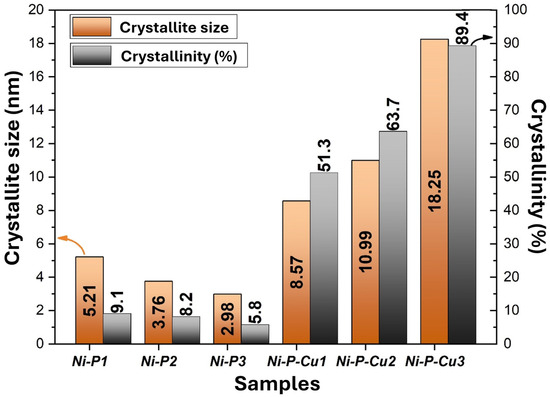 Figure 8 presents the crystallite size (in nanometers) and crystallinity percentage of each coating sample, showing the structural differences between Ni-P and Ni-P-Cu coatings. The Ni-P samples (Ni-P1, Ni-P2, Ni-P3) exhibit relatively small crystallite sizes, ranging from 2.98 to 5.21 nm, and low crystallinity percentages, with values between 5.8% and 9.1%. These results align with the predominantly amorphous structures observed in the XRD patterns, where broad humps indicated limited crystalline domains. The trend shows that as the current density and anode–cathode distance increase (from Ni-P1 to Ni-P3), crystallite size decreases and crystallinity percentage remains low, suggesting that higher deposition rates limit the formation of ordered structures in Ni-P coatings. In contrast, the Ni-P-Cu samples (Ni-P-Cu1, Ni-P-Cu2, Ni-P-Cu3) demonstrate significantly larger crystallite sizes and higher crystallinity percentages. The crystallite sizes range from 8.57 nm for Ni-P-Cu1 to 18.25 nm for Ni-P-Cu3, while the crystallinity percentages increase from 51.3% to 89.4%. This increase in structural order can be attributed to the incorporation of Cu, which acts as a nucleating agent, promoting the growth of crystalline domains within the Ni-P matrix. The highest crystallinity and crystallite size observed in Ni-P-Cu3 reflects the combined effect of high current density and greater anode–cathode distance, which enhance Cu deposition and lead to more ordered and larger crystalline domains. These trends indicate that the addition of Cu and the adjustment of deposition parameters significantly enhance the crystalline structure of the coatings, making Ni-P-Cu coatings, especially Ni-P-Cu3, more suitable for applications requiring high thermal and electrical conductivity due to their improved crystallinity.