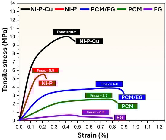 Figure 9 shows the tensile stress–strain behavior of different materials, including Ni-P-coated PCM/EG composite packs, Ni-P-Cu-coated PCM/EG composite packs, PCM/EG composite packs, pure PCM, and pressed EG blocks. The tensile stress is plotted against strain, with maximum tensile strength values (Fmax) indicated for each sample. The Ni-P-Cu-coated PCM/EG sample exhibits the highest tensile strength among all samples, with a maximum stress of Fmax = 10.2 MPa at a strain of approximately 0.22%. This high tensile strength suggests that the Ni-P-Cu coating substantially enhances the mechanical performance of the PCM/EG composite. The addition of Cu to the Ni-P matrix increases crystallinity and provides a rigid and cohesive structure, which is reflected in the material’s ability to withstand high stress with minimal strain. The Ni-P-coated PCM/EG composite achieves a maximum tensile strength of Fmax = 5.5 MPa at around 0.18% strain. Although this strength is lower than that of the Ni-P-Cu-coated sample, it is still significantly higher than the uncoated PCM/EG composite. The Ni-P layer improves the mechanical stability of the PCM/EG composite by creating a more compact and cohesive structure, although it lacks the additional reinforcement provided by Cu, which contributes to the comparatively lower strength. The uncoated PCM/EG composite has a maximum tensile strength of Fmax = 4.0 MPa at a strain of about 0.7%. This composite demonstrates moderate mechanical strength with a higher strain tolerance than the coated samples, indicating some flexibility. The PCM matrix contributes to this flexibility, while the EG particles provide structural reinforcement. However, the absence of a coating results in lower overall tensile strength compared to the coated versions. The pure PCM sample reaches a maximum tensile strength of Fmax = 2.5 MPa at approximately 0.6% strain. Without reinforcement from EG particles or any surface coating, PCM alone shows limited mechanical strength and is relatively flexible. This low tensile strength indicates that PCM by itself may not be suitable for applications requiring substantial load-bearing capacity, although its flexibility could be advantageous in certain thermal applications. The pressed EG sample exhibits the lowest tensile strength, with Fmax = 0.5 MPa at around 0.2% strain. This low strength is expected due to the lack of bonding within the EG particles, which results in a fragile structure. While EG is beneficial as a thermally conductive filler, its standalone mechanical properties are insufficient for load-bearing applications.