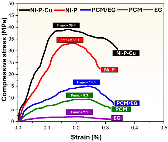 Figure 10 illustrates the compressive stress–strain behavior of various materials, including Ni-P-coated PCM/EG, Ni-P-Cu-coated PCM/EG, PCM/EG composite, pure PCM, and pressed EG. The Ni-P-Cu-coated PCM/EG exhibits the highest maximum compressive strength, reaching Fmax = 39.4 MPa at a strain of approximately 0.25%. This high compressive strength is attributed to the presence of Cu, which reinforces the structure by increasing the crystallinity and mechanical integrity of the Ni-P coating. The Ni-P-Cu coating creates a rigid and stable network that effectively distributes the compressive load, preventing localized deformation and enhancing the load-bearing capacity under compression. The Ni-P-coated PCM/EG composite has a compressive strength of Fmax = 33.1 MPa at around 0.23% strain. This strength, although slightly lower than Ni-P-Cu, still demonstrates a significant improvement over the uncoated PCM/EG composite. The Ni-P layer adds structural integrity by forming a dense compact coating around the PCM/EG structure, providing resistance to compressive forces. However, the lack of Cu limits the crystallinity, which results in slightly lower compressive strength compared to Ni-P-Cu. The uncoated PCM/EG composite shows a maximum compressive strength of Fmax = 14.4 MPa at a strain of about 0.27%. This intermediate compressive strength reflects the structural support provided by the EG particles within the PCM matrix, allowing it to absorb and distribute compressive loads to a certain extent. However, without the protective coating, the PCM/EG composite is more susceptible to localized deformation and has reduced strength compared to the coated versions. Pure PCM achieves a compressive strength of Fmax = 9.3 MPa at approximately 0.24% strain. PCM alone provides a limited compressive resistance, as it lacks both reinforcement from EG particles and protective coatings. The relatively low compressive strength and moderate strain tolerance indicate that PCM may deform more easily under load, making it less suitable for applications requiring high compressive strength. The EG sample has the lowest maximum compressive strength, reaching Fmax = 2.1 MPa at around 0.12% strain. This minimal strength can be attributed to the weak interparticle bonding within the EG structure, which leads to a highly porous and fragile material under compression. While EG is valuable for its thermal conductivity properties, its standalone structure is insufficiently robust to withstand compressive forces effectively. The enhanced compressive strength of the Ni-P-Cu-coated PCM/EG sample is a result of the Ni-P-Cu layer’s crystalline structure, which adds rigidity and cohesion to the composite. The Cu addition within the Ni-P matrix promotes crystallization, which strengthens the interatomic bonding and helps to evenly distribute the compressive force throughout the material. This makes Ni-P-Cu-coated PCM/EG an excellent candidate for applications where both high compressive strength and structural stability are required. The Ni-P-coated PCM/EG, while lacking the additional reinforcement provided by Cu, still shows a substantial increase in compressive strength. The dense Ni-P layer around the PCM/EG structure adds resistance to compression by forming a compact cohesive coating. This improved structural integrity makes Ni-P-coated PCM/EG suitable for applications that demand moderate compressive strength but do not require the maximum performance of Ni-P-Cu. For the uncoated PCM/EG composite, the presence of EG particles provides a basic level of reinforcement, allowing the PCM/EG composite to resist compressive forces to some degree. However, without the enhanced cohesion from the coating, the PCM/EG structure is less effective at handling high compressive loads, as the EG particles may separate or shift under stress, leading to lower compressive strength. Pure PCM and pressed EG samples show significantly lower compressive strengths. PCM, though able to absorb strain moderately well, lacks reinforcement, making it prone to deformation under compression. The pressed EG sample’s low compressive strength highlights its fragility in bulk form, as the loose particle structure is unable to resist compressive forces effectively. In conclusion, Ni-P-Cu-coated PCM/EG and Ni-P-coated PCM/EG demonstrate the highest compressive strengths, with Ni-P-Cu outperforming all other samples due to the structural reinforcement provided by Cu. These materials are expected to perform well in applications requiring high compressive strength and mechanical stability. Many studies underscore the effectiveness of copper in reinforcing the mechanical attributes of Ni-P coatings, making them highly suitable for applications where enhanced durability and mechanical stability are required [42,80,81]. Moreover, in many studies in the literature, the improvement in mechanical properties in similar structures has been achieved through the use of polymer matrices. However, the use of polymer matrices significantly reduces thermal conductivity. For example, Yang et al. [82] reported that the strength of an EG/PCM structure was approximately 7 MPa with a thermal conductivity of about 8 W/m·K. While the use of a polymer matrix increased strength to over 8 MPa, it caused a reduction of approximately 30% in thermal conductivity. In contrast, the current study demonstrates that high thermal conductivity coatings not only enhanced the mechanical strength but also improved thermal conductivity performance.