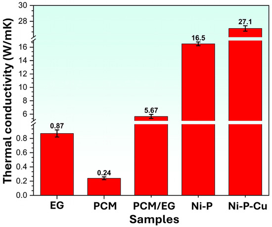 In Figure 11, the thermal conductivity values for pure PCM, expanded graphite (EG), PCM/EG composite, Ni-P-coated PCM/EG, and Ni-P-Cu-coated PCM/EG are displayed, showcasing the enhancement in thermal conductivity through different material modifications and coatings. Pure PCM exhibits the lowest thermal conductivity at approximately 0.24 W/m·K, which can be attributed to its molecular structure and low density. The crystalline structure and weak atomic bonds in paraffin-based PCM limit its ability to conduct heat effectively, making it a poor thermal conductor. On the other hand, expanded graphite shows a thermal conductivity of around 0.87 W/m·K. This relatively higher conductivity is due to the strong covalent bonds between carbon atoms and the planar arrangement of graphite sheets, which facilitate phonon movement and enable efficient in-plane heat transfer. However, the porous structure of expanded graphite, with nearly 90% porosity, restricts its overall thermal conductivity by limiting continuous pathways for heat transfer. When PCM is impregnated into expanded graphite to form a PCM/EG composite, the thermal conductivity rises to about 5.67 W/m·K. This improvement is largely due to the PCM filling the porous structure of graphite, thereby creating additional points of contact between graphite particles and enhancing heat conduction pathways within the composite. The PCM material not only fills the voids but also brings its phase-change capability, allowing it to absorb and store latent heat, which contributes to better thermal stability and more effective heat dissipation. Applying a Ni-P coating onto the PCM/EG composite further increases its thermal conductivity to approximately 16.5 W/m·K. The Ni-P coating, with its metallic nature, introduces effective heat transfer pathways due to the strong metallic bonds that facilitate rapid heat conduction. The presence of phosphorus in the coating provides additional structural stability, ensuring a uniform and continuous heat-conductive layer around the PCM/EG composite. This metallic coating significantly improves the ability of the composite to dissipate heat under thermal load. The highest thermal conductivity, measured at 27.1 W/m·K, is achieved by the Ni-P-Cu-coated PCM/EG composite. The addition of copper, a metal with high intrinsic thermal conductivity, further enhances heat transfer within the coating by optimizing the crystalline structure. Copper atoms improve the efficiency of phonon transport and minimize dislocation movement, which allows for more efficient heat conduction across the composite. This high thermal conductivity in the Ni-P-Cu-coated PCM/EG composite makes it particularly suitable for applications in thermal management, such as battery systems, where efficient heat dissipation is essential for preventing overheating and ensuring operational safety. The enhancement in thermal conductivity through these modifications is supported by multiple mechanisms. The Ni-P and Ni-P-Cu coatings provide continuous metallic pathways that facilitate thermal energy transfer far more efficiently than uncoated composites. Expanded graphite’s natural high thermal conductivity due to its hexagonal carbon arrangement is leveraged within the PCM/EG composite, where PCM fills the graphite pores and creates closer contact between particles, enhancing phonon transport. Additionally, PCM’s phase-change properties contribute to thermal stability by absorbing and releasing heat as it transitions between phases. While studies in the literature [57,65,83,84] show that the thermal conductivity of EG/PCM composites with similar ratios of EG and PCM typically ranges between approximately 1 and 10 W/m·K, this study clearly demonstrates the significant improvement achieved through Ni-P and Ni-P-Cu surface coatings, with values increasing up to approximately 27 W/m·K. The combination of these structural and material modifications, along with the protective and conductive metallic coatings, results in a highly effective heat management solution, ideal for applications that demand both thermal and structural performance.