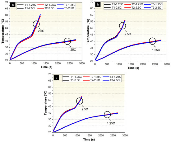 In Figure 12, the local temperature profiles for different configurations indicate a characteristic pattern during the discharge process. Initially, there is a linear temperature increase, followed by a period where the rate of temperature rise decreases, and finally, another phase with a linear increase in temperature. The second phase, where the temperature rises slowly, is related to the phase change temperature of the composite material (RT-42, approximately 38–43 °C), during which the PCM absorbs latent heat in the solid-to-liquid transition. This phase change allows the composite structure to absorb the heat generated within the battery pack, thereby significantly suppressing the temperature increase. Once the phase transition is complete, the rate of temperature rises resumes due to sensible heat storage. At lower discharge rates, the third phase is not observed because the phase transition is incomplete. Figure 12a illustrates the temperature variation in PCM/EG battery packs under 1.25C and 2.5C discharge rates. The initial phase is characterized by a steady increase in temperature, with a noticeable plateau around 38 °C to 43 °C. This corresponds to the phase change process of the PCM, where the material absorbs latent heat during the solid-to-liquid transition. At 2.5C, the phase changes complete faster, resulting in a steeper temperature increase afterward due to the higher discharge rate and faster heat generation from internal resistance. Figure 12b depicts the temperature evolution in Ni-P-coated PCM/EG battery packs for the same discharge rates. Compared to PCM/EG packs, the Ni-P coating enhances thermal conductivity, leading to a slightly more efficient heat distribution during the discharge process. The latent heat absorption phase (38–43 °C) is more pronounced and lasts longer under both discharge rates, especially at 1.25C, indicating improved thermal management due to the Ni-P coating. Figure 12c presents the temperature profiles for Ni-P-Cu-coated PCM/EG packs under 1.25C and 2.5C discharge rates. The addition of Cu to the coating further improves thermal conductivity and heat dissipation. This results in the slowest temperature rise among all configurations. At 2.5C, the PCM undergoes phase change more efficiently, and the temperature plateau during the latent heat absorption phase is extended. The overall peak temperature is also lower compared to PCM/EG and Ni-P-coated PCM/EG packs, highlighting the superior thermal performance of this configuration. Considering the highest temperature levels reached in the same period, it can be noted that the temperature increases steadily, reaching a peak of approximately 43 °C before stabilizing at 1.25C for PCM/EG packs (Figure 12a). The plateau corresponds to the phase change temperature range of the PCM (38 –43 °C), where the PCM absorbs latent heat during the solid-to-liquid transition. At 2.5C, the temperature rises faster, peaking at approximately 61 °C. The higher discharge current accelerates the heat generation, and the phase change completes earlier, leading to a steeper rise in temperature after the phase transition for PCM/EG packs as seen in Figure 12a. Figure 12b displays the temperature behavior of Ni-P-coated PCM/EG battery packs under the same discharge rates. At 1.25C, the temperature reaches approximately 41 °C at the phase change plateau and peaks at around 45 °C. The Ni-P coating enhances thermal conductivity, leading to better heat management and a slightly lower peak temperature than uncoated PCM/EG packs. At 2.5C, the temperature increases more rapidly but peaks at a slightly lower value of approximately 57 °C, indicating improved thermal performance due to the Ni-P coating. The phase change plateau remains evident, suggesting effective latent heat absorption. Figure 12c illustrates the temperature variation in Ni-P-Cu-coated PCM/EG battery packs under 1.25C and 2.5C discharge rates. At 1.25C, the temperature stabilizes at the phase change plateau around 39 °C and peaks at 42 °C, the lowest peak among all configurations. The addition of Cu further improves heat dissipation and thermal conductivity, resulting in better temperature control. At 2.5C, the temperature rises faster but stabilizes at a peak of approximately 53 °C, which is significantly lower than the peaks observed in the PCM/EG and Ni-P-coated PCM/EG packs. This configuration demonstrates superior thermal performance, effectively managing the heat generated even at high discharge rates. Similarly, the addition of copper to enhance thermal conductivity has been applied in studies in the literature, effectively delaying the time required to reach the critical temperature [87,88].