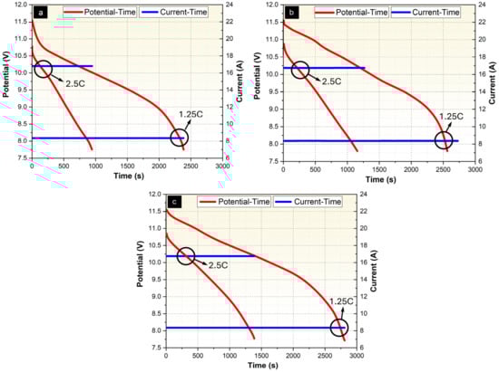In Figure 13, the time-dependent voltage decay is displayed for PCM/EG, Ni-P-coated PCM/EG, and Ni-P-Cu-coated PCM/EG packs under both discharge rates. The discharge profiles of PCM/EG battery packs under 1.25C and 2.5C rates are presented in Figure 13a. For the 1.25C discharge rate, the voltage gradually decreases from 11.5 V to around 7.5 V, with the discharge lasting approximately 2400 s. During this period, the current trend remains constant at 8.3 A, reflecting stable performance over the discharge cycle. This relatively longer duration highlights the moderate energy output capacity of the PCM/EG pack at lower current rates. In contrast, for the 2.5C rate, the voltage drops significantly faster, resulting in a shorter discharge duration of about 900 s, while the current stabilizes at 10.1 A. The rapid voltage decline reflects the limited thermal and electrochemical management capabilities of the PCM/EG pack under higher currents. Figure 13b shows the voltage and current profiles of Ni-P-coated PCM/EG battery packs. At 1.25C, the coating improves the discharge duration to approximately 2600 s, compared to the uncoated PCM/EG pack. The voltage shows a controlled decline from 11.5 V to 7.5 V, while the current remains steady at 8.3 A. The Ni-P coating enhances electrochemical stability, leading to better utilization of the energy stored in the battery. When subjected to 2.5C, the discharge duration increases to 1200 s—a noticeable improvement over the PCM/EG pack. Although the current is maintained at 10.1 A, the voltage curve indicates that the Ni-P coating helps in reducing the rate of voltage drop, likely due to better surface conductivity and reduced internal resistance. The performance of Ni-P-Cu-coated PCM/EG packs is depicted in Figure 13c. Under the 1.25C rate, the discharge lasts for about 2800 s, which is longer than both the PCM/EG and Ni-P-coated packs. The voltage transitions smoothly from 11.5 V to 7.5 V, while the current remains stable at 8.3 A. The additional Cu layer not only enhances thermal conductivity but also improves charge transfer efficiency, resulting in prolonged discharge duration. At the 2.5C rate, the pack demonstrates the best performance among the three configurations, with a discharge duration of 1400 s. The voltage decline is slower compared to the other cases, further highlighting the advantages of the Ni-P-Cu coating in managing high discharge currents by improving thermal and electrochemical stability. Consequently, The Ni-P-Cu-coated PCM/EG pack achieves the best results, delivering longer discharge times and more stable voltage profiles. This configuration effectively handles both thermal management and electrochemical stability, making it superior for high-performance applications.