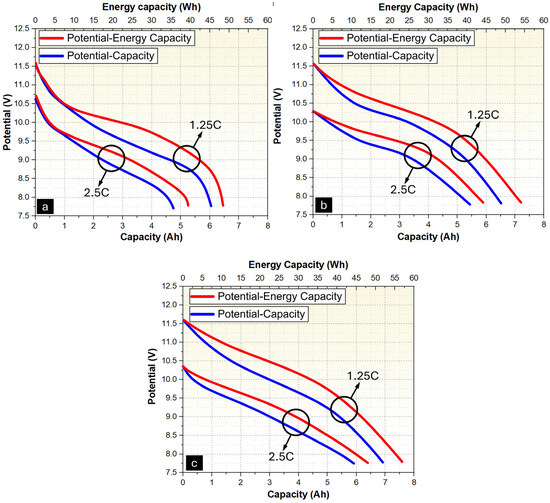 Figure 14 presents the relationship between voltage decay, discharge capacity (Ah), and energy capacity (Wh) for each configuration under the two discharge rates. The voltage-capacity and voltage-energy capacity relationships for the PCM/EG pack are shown in Figure 14a. The energy capacity reaches approximately 50 Wh, while the total capacity is near 6 Ah, showing moderate energy retention at 1.25C. The voltage declines steadily from 11.5 V to 7.5 V, illustrating the pack’s limited ability to sustain high energy output at the lower discharge rate. At 2.5C, the energy capacity decreases significantly to around 30 Wh, while the capacity reaches just above 4 Ah. The steep decline in voltage, coupled with the reduced energy output, highlights the thermal and electrochemical limitations of PCM/EG packs under high discharge currents. Figure 14b presents the performance of Ni-P-coated PCM/EG packs. For the 1.25C discharge rate, the energy capacity improves to 55 Wh, and the capacity increases to 6.5 Ah. The voltage profile shows a smoother decline compared to the uncoated PCM/EG pack, reflecting enhanced energy retention due to the Ni-P coating. At 2.5C, the energy capacity increases to approximately 40 Wh, with the total capacity reaching nearly 5 Ah. The slower voltage decline indicates that the Ni-P coating mitigates thermal and electrical losses, enabling improved performance at higher discharge rates. The Ni-P-Cu-coated PCM/EG pack results are depicted in Figure 14c. The energy capacity further improves to nearly 58 Wh, with the total capacity reaching 6.8 Ah for the rate of 1.25C. The voltage profile remains stable for a longer duration, emphasizing the enhanced charge transfer and thermal conductivity provided by the Cu coating. The energy capacity is maintained at around 45 Wh, while the capacity reaches 5.5 Ah at 2.5C. This configuration demonstrates the slowest voltage decline among the three, highlighting the superior performance of the Ni-P-Cu coating in sustaining high energy output under demanding conditions.
