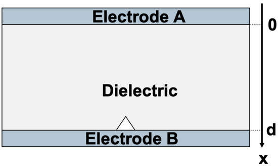 The phenomenon of fracto-emission is the instantaneous apparition of charges (Figure 8), so that , , and . Therefore, the surface charge density becomes consequently different from zero. Hence, there is a temporal evolution of the surface charge densities due to crack creation and/or propagation, each time it causes fracto-emission. From now on, we will only focus on the volume consisting of the crack in the insulator, the charge, and the electrodes on each side of the insulator.