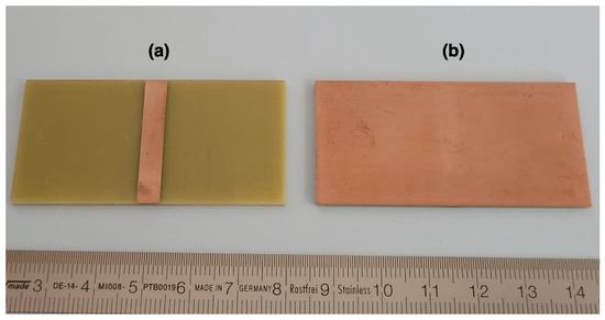 Glass-reinforced epoxy laminate (PCB-FR4), 1 mm thickness, 60 mm length and 30 mm width. The copper metallization on both side has a thickness of 35 m, with (a) the top side of the sample and (b) the bottom side.