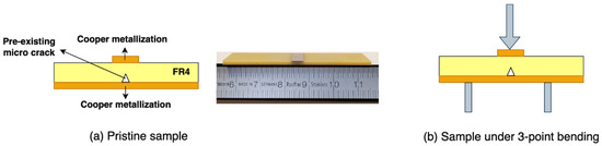 Glass-reinforced epoxy laminate (PCB-FR4) (a) Pristine sample with metallization and (b) Sample placed under the 3-point bending.