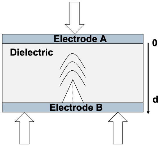 Equation (9) will be equal to 0 since , so , which results in Equation (15); the surface charge density is also 0. During the release of an induced pressure wave, no electrical signal will be detected.