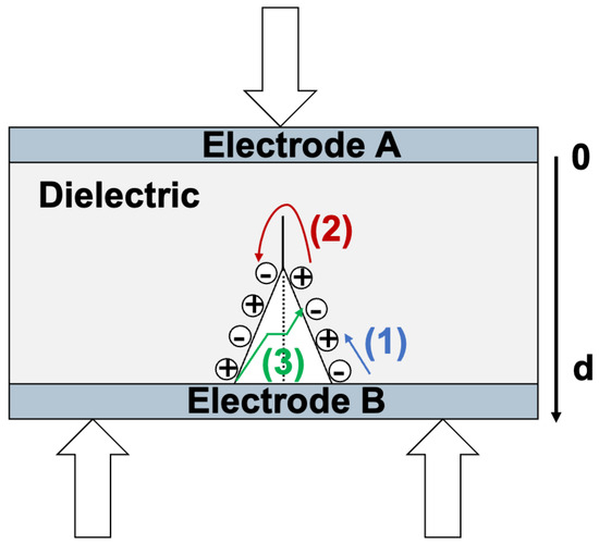 In Figure 9, (1) refers to charge recombination on the crack surface, while (2) refers to charge recombination through the volume, and (3) refers to charge recombination across the crack. These phenomena will induce a change in surface charge density, leading to an external current. On the other hand, if charge recombination occurs along a plane perpendicular to the d-axis, no external signal will be induced.