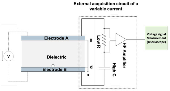 Figure 11 shows the global structure of the detection circuit. This circuit could detect three phenomena: (1) crack creation and/or propagation, (2) charge recombination, and (3) pressure waves. It is important to note that crack creation and propagation are often accompanied by pressure waves, and in the case where a high voltage is also applied, partial discharges (PD) could also occur.