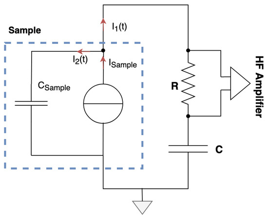 In order for the acquisition circuit to detect the fracto-emission induced current as a result of the creation and/or propagation of a crack, we must make sure that , being the leak current directly linked to the phenomena. This can be obtained if . Therefore, acts as a parasitic capacitance that absorbs, mainly by dielectric polarization, a part of the crack induced current. The lower the high-frequency impedance, the higher the crack induced current () acquired and amplified by the measuring circuit. Hence, as long as the impedance condition, , is respected, we will be able to observe the leak current.