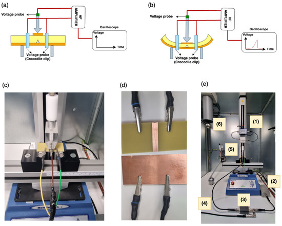 All the elements of the experimental setup are shown together in Figure 13. The full setup is composed of the upper loading element of the 3-point bending setup, which is in contact with the upper (smaller) copper metallization. Once the sample is in place, the two cables, yellow and green (left and right cables) in Figure 13c, are attached with crocodile clips to the sample (Figure 13d). The brown cable (central) is plugged into the upper loading element (stainless steel), representing the positive side of the circuit (Figure 13a) and attached to the voltage probe. All three cables are connected to the high-frequency (HF) amplifier, part (a), powered by a constant DC voltage. A “T” connector is used to connect the power supply and the amplifier, and the third one is used to link to the oscilloscope (DPO4054; Tektronix, Beaverton, OR, USA), which is the final output.