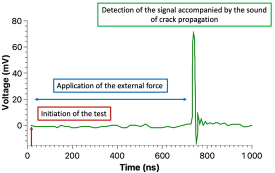 The tests consisted of applying mechanical force in order to propagate a crack through the insulating material. During the tests, we were able to record the current signal. As shown in Figure 14, initially there is no signal detection, only the noise detected by the acquisition circuit. The signal was only detected once the external force had reached a certain value (between 100 N and 250 N) for which we assume the critical force to propagate a crack has been surpassed.