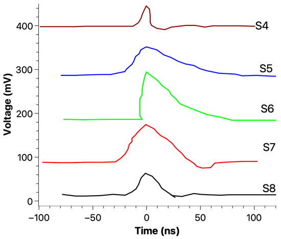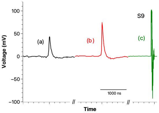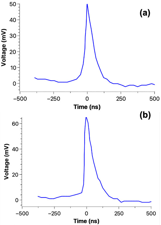 For the samples measured, it was not possible to perform an estimation of the surface charge generated at the armatures of the sample, according to Equation (15), as some parameters cannot be defined experimentally at this stage, such as <x> (the average depth of charge penetration). Nevertheless, because the surface charge is generated in a few ns, a current, our HF amplifier, set to 18.5 dB was sufficient to produce peak signals in the range of 40 mA to 120 mA.