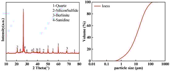 The cement used was P.O 42.5 ordinary Portland cement (brand name Lianshi), produced by Fujian Hongchang Concrete Co., Ltd. (Fuzhou, China). The GGBFS was S95-grade ground granulated blast furnace slag, produced by Henan Wuhu Technology Co., Ltd. (Wuhu, China); FA met the technical requirements of Class F Grade II, produced by Fujian Huadian Kemen Power Generation Co., Ltd. (Fuzhou, China); the loess, after crushing, was used after drying to a constant weight with particle sizes less than 2.36 mm, collected from the engineering waste soil of Fuzhou High-Tech Zone; the CS had a pH of 12.7, produced by Henan Wuhu Technology Co., Ltd. (Wuhu, China). The chemical composition of the loess, cement, GGBFS, FA, and CS are shown in Table 1, and the physical parameters of the soil sample is shown in Table 2. The XRD and particle size distribution curves of the soil samples are shown in Figure 1, and the SEM images are shown in Figure 2.