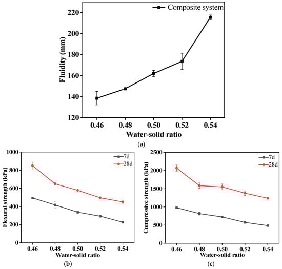 Effects of different water–solid ratios on the workability and mechanical strength of CFGC-PFSS: (a) the fluidity of PFSS under different water-solid ratios; (b) the flexural strength of PFSS under different water-solid ratios; (c) the compressive strength of PFSS under different water-solid ratios.