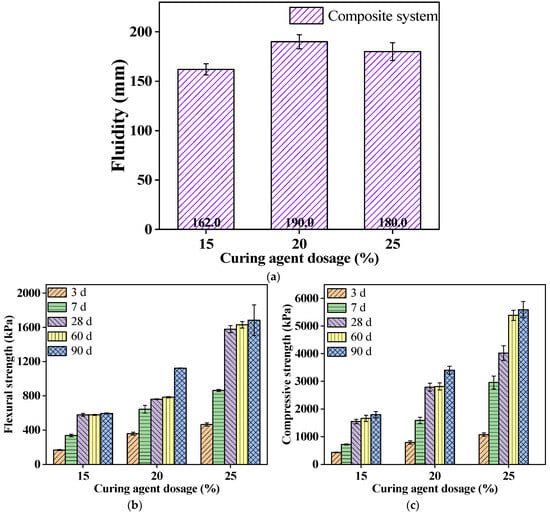The influence of the curing agent dosage in CFGC-PFSS on fluidity and mechanical strength: (a) the fluidity of PFSS under different curing agent dosages; (b) the flexural strength of PFSS under different curing agent dosages; (c) the compressive strength of PFSS under different curing agent dosages.