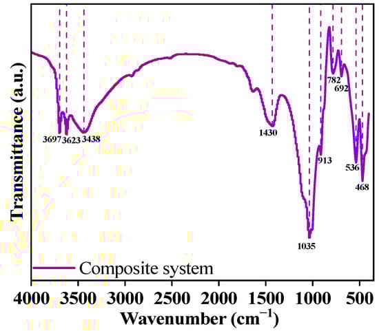 The FT-IR spectrum of the sample at 28 d is shown in Figure 6, clearly identifying 10 different peaks. The peaks near 3697 cm−1, 3697 cm−1, and 3438 cm−1 are typically associated with the stretching vibrations of hydroxyl groups (-OH) in the material []. The absorption peaks near 1430 cm−1 and 1035 cm−1 are attributed to the stretching vibrations of C-O bonds and the out-of-plane bending vibrations of CO32− [,], which originate from CaCO3 and HT, respectively. The absorption peak near 913 cm−1 is attributed to the stretching vibrations of Si(Al)-O bonds [], while the absorption peaks near 782 cm−1 and 692 cm−1 are attributed to the Al-OH vibration peaks and the symmetric bending vibrations of Si-O-Si bonds in C-S-H, respectively []. The absorption peaks around 536 cm−1 and 468 cm−1 are caused by the out-of-plane and in-plane bending vibrations of Si(Al)-O bonds, mainly originating from the C-A-S-H gel [].