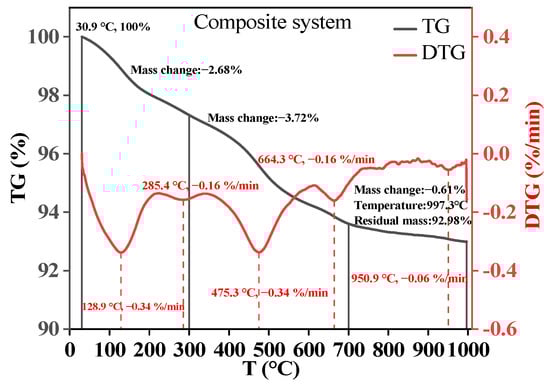 The TG-DTG curve of the composite cementitious material after 28 d of curing is shown in Figure 7. It can be observed from the figure that there is a significant weight loss in the sample within the temperature range of 100–150 °C, which is mainly caused by the evaporation of free water within the cementitious paste []. The weight loss peak near 300 °C is primarily due to the decomposition of the C-A-S-H gel []. The weight loss between 450 and 500 °C is caused by the decomposition of Ca(OH)2 [], and the weight loss of the paste within the range of 650–700 °C is due to the decomposition of calcite, indicating the presence of CaCO3 in the cementitious paste []. These results are consistent with the test results of XRD and FT-IR.