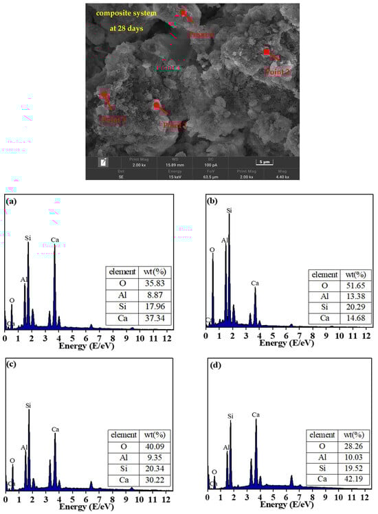 The EDS results of the CFGC-PFSS at 28 d are shown in Figure 8. It can be observed from the figure that the main elements in the 28 d sample include Ca, Si, Al, and O. Combined with the XRD results, it can be determined that the hydration products are C-S-H/C-A-S-H gels and needle-like AFt [,].