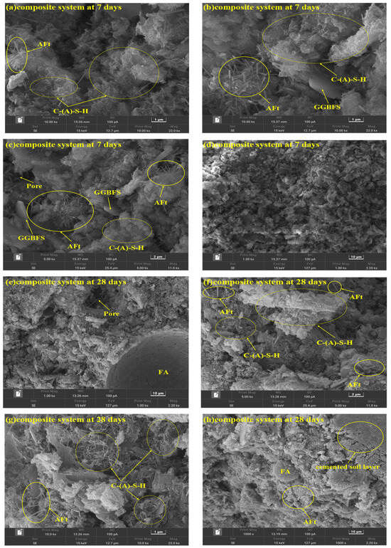 Figure 9 displays the SEM images of the CFGC-PFSS at 7 d and 28 d. It can be observed from the images that in the early stages of hydration, the gel has not yet developed into a dense structure, and there are a large number of cracks and pores present. As the curing age increases, the pores in the samples decrease, and the microstructure becomes more compact. Concurrently, as hydration progresses, the quantity of hydration products in the samples increase, and a large number of needle-like AFt and reticular C-S-H and C-A-S-H gels appear, which is consistent with the results shown by the FT-IR, TG-DTG, and EDS curves. The three cementitious materials coagulate to form a dense spatial reticular structure, encapsulating soil particles and forming a consolidated body with certain mechanical strength. Therefore, the mechanical strength of the samples significantly increase after 28 d of standard curing compared to 7 d.