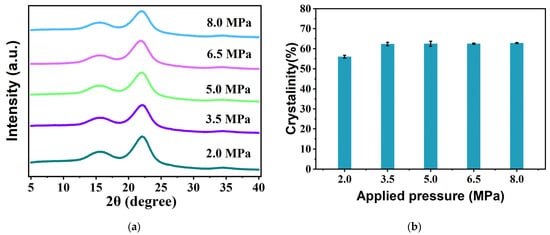 The mass fraction of crystalline regions in cellulosic materials plays a pivotal role in their chemical, mechanical, and physical properties. Figure 3a,b show XRD patterns of the bio-boards manufactured under various pressures, accompanied by a comparison of their crystallinity. The major diffraction peaks at 2θ = 14.8° (−110), 16.3° (110), 22.6° (200), and 34.6° (004) correspond to cellulose type I [37]. The peak regions and other areas are categorized as crystalline and non-crystalline regions, respectively. Cellulose type I encompasses a combination of two distinct crystalline forms: cellulose Iα (trigonal crystalline system) and Iβ (monoclinic crystalline system). Cellulose type I crystals form through molecular hydrogen bonding within the cellulose matrix, thereby contributing to their stability. Prior studies have demonstrated that a high crystallinity signifies a tightly packed arrangement of fiber chains, which is crucial for achieving enhanced mechanical strength, density, and dimensional stability [38,39]. Notably, our observations reveal an increase in the crystallinity with increasing pressure. However, remarkably, the change in the crystallinity becomes negligible once the pressure reaches 3.5 MPa. Within the pressure range of 3.5–8.0 MPa, the increase in the crystallinity is only 0.44%. Furthermore, the crystallinity of the bio-boards produced at 2.0 MPa differs by 6% from that of the bio-boards produced under the other pressure conditions. These results indicate a gradual stabilization of the bio-board structure beginning at 3.5 MPa. Additionally, these findings align with the SEM images depicted in Figure 2, which illustrate minimal surface alteration of the bio-boards between 3.5 MPa and 8.0 MPa. These discoveries provide valuable insights into the physical and mechanical properties of the bio-boards.