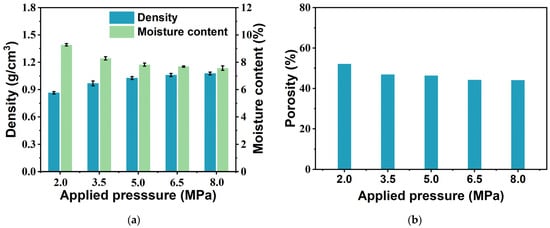 Density, moisture content, and porosity of bio-board samples produced at different pressures. (p < 0.05) (a) Density and moisture content; (b) porosity.