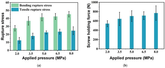 Rupture stress and screw holding force of bio-board samples produced at different pressures. (a) Bending rupture stress and tensile rupture stress; (b) screw holding force. (p < 0.05).