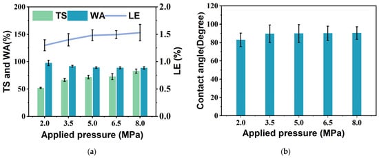 WA, TS, LE, and contact angle of bio-board samples produced at different pressures. (a) Water absorption (WA), thickness swelling (TS), and linear expansion (LE); (b) contact angle. (p < 0.05).