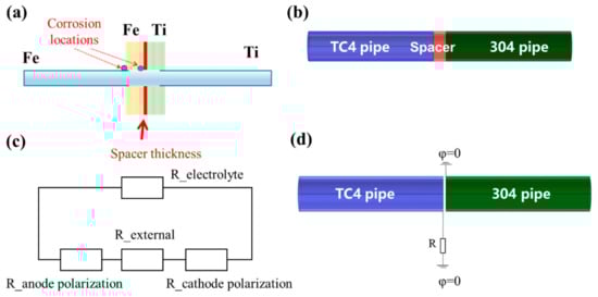 Details of model. (a) Diagram of galvanic corrosion; (b) diagram of TC4/304 pipe couple; (c) equivalent circuit model; (d) diagram of the model.