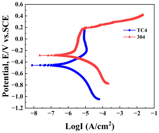 Tafel curve for TC4 and 304 in 3.5 wt.% NaCl solution at 25 °C.