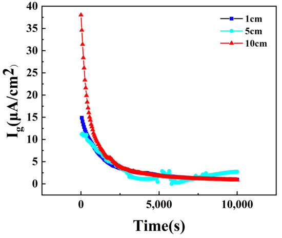 The curves of the corrosion current of different anode and cathode distances obtained through experimental testing over time are shown in Figure 5. To determine the experimental test value of the galvanic current for comparison with the simulated results of galvanic corrosion as the distance between the anode and cathode varies, the average stabilized galvanic current is calculated.